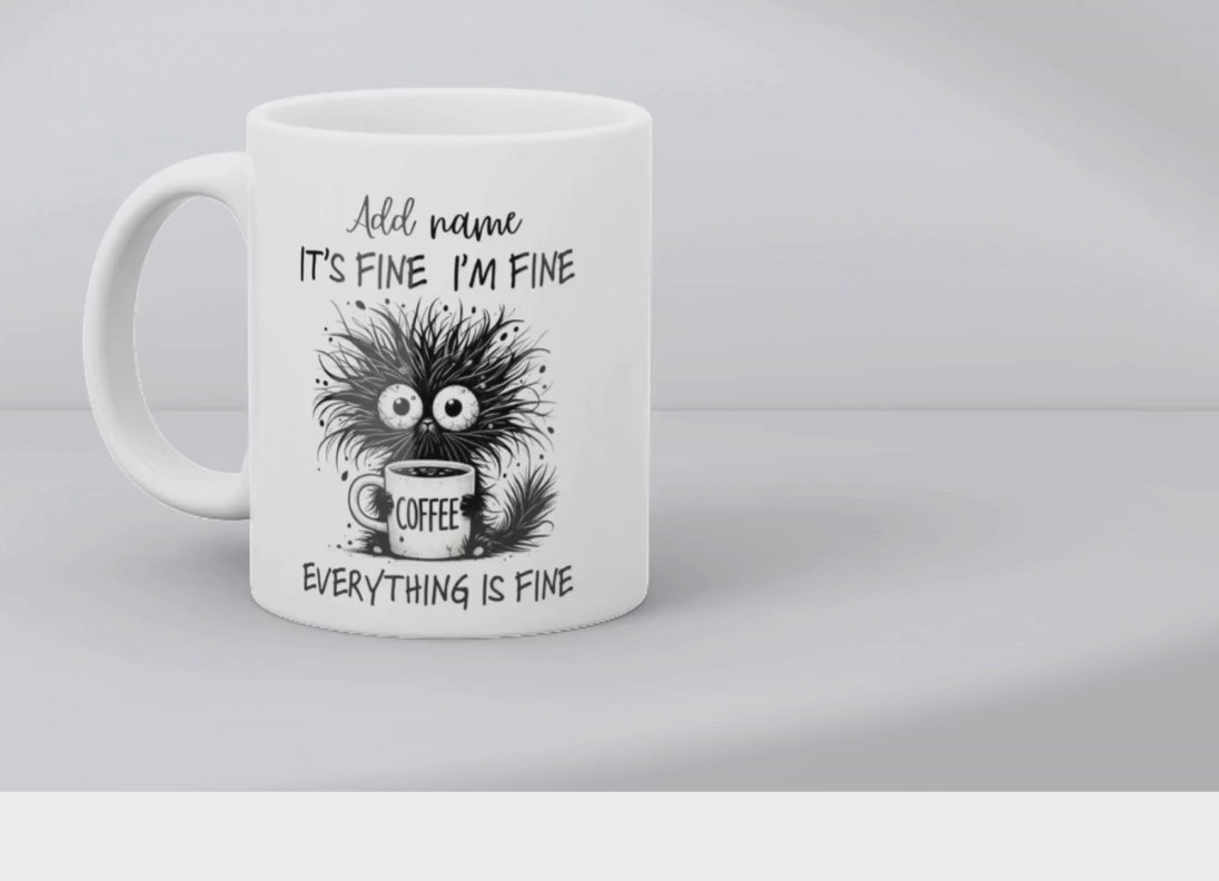 Design: “It’s Fine, I’m Fine, Everything Is Fine” text with adorable fuzzy monster and coffee cup
