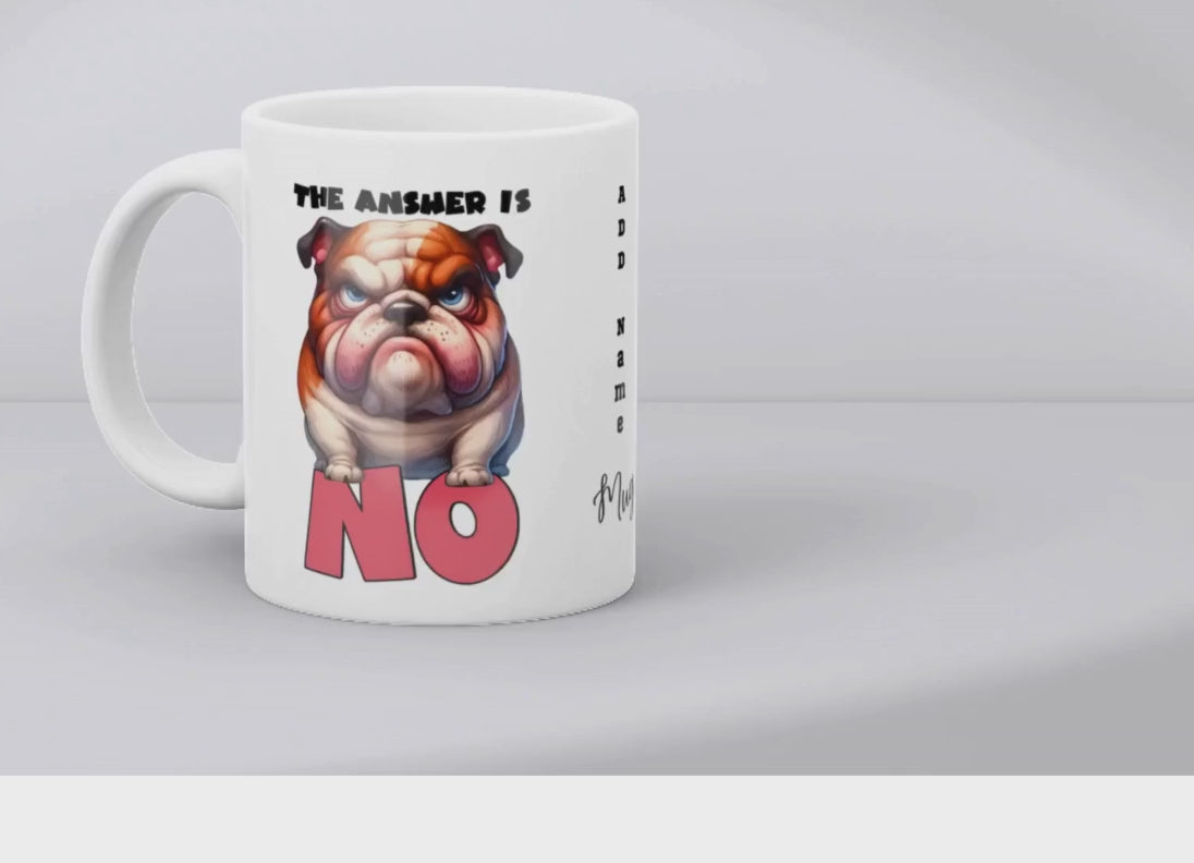 • Design: grumpy bulldog with bold “The Answer Is No” quote