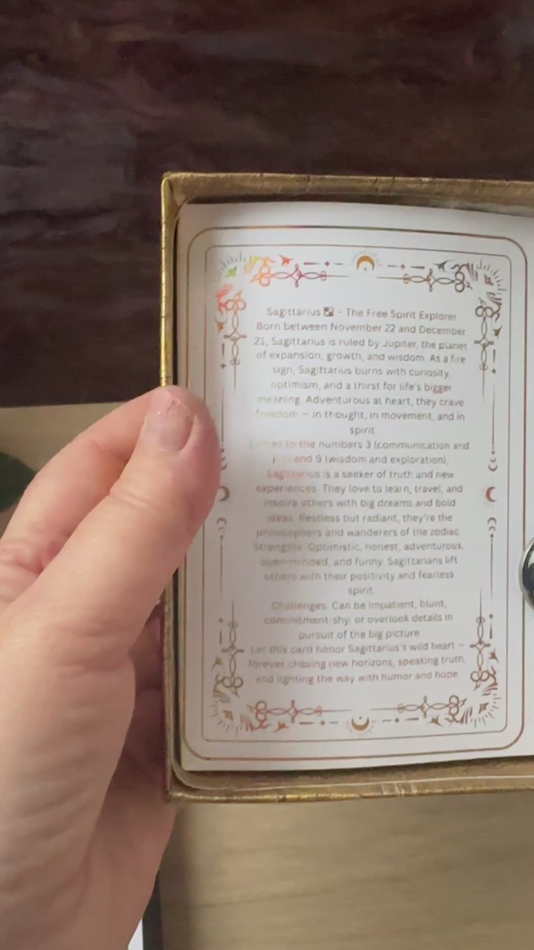 The backing card, detailed in gold, includes your sign’s description, strengths, weaknesses, and planetary connection — turning your gift into something truly meaningful.